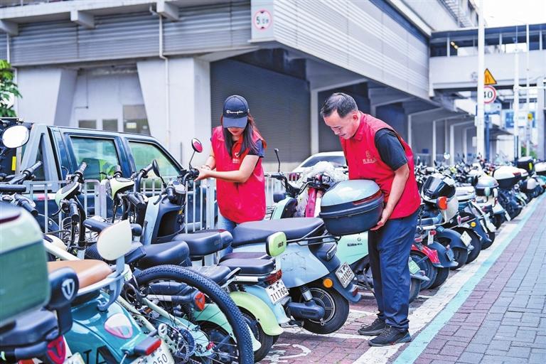 志愿者在白石龙地铁站周边路段整理非机动车。