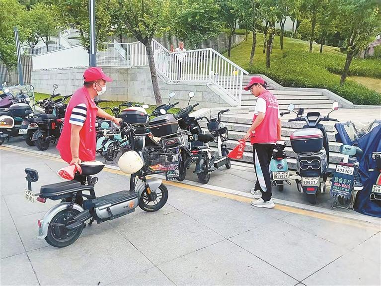 志愿者在地铁4号线松元厦站附近将电动自行车摆放整齐。