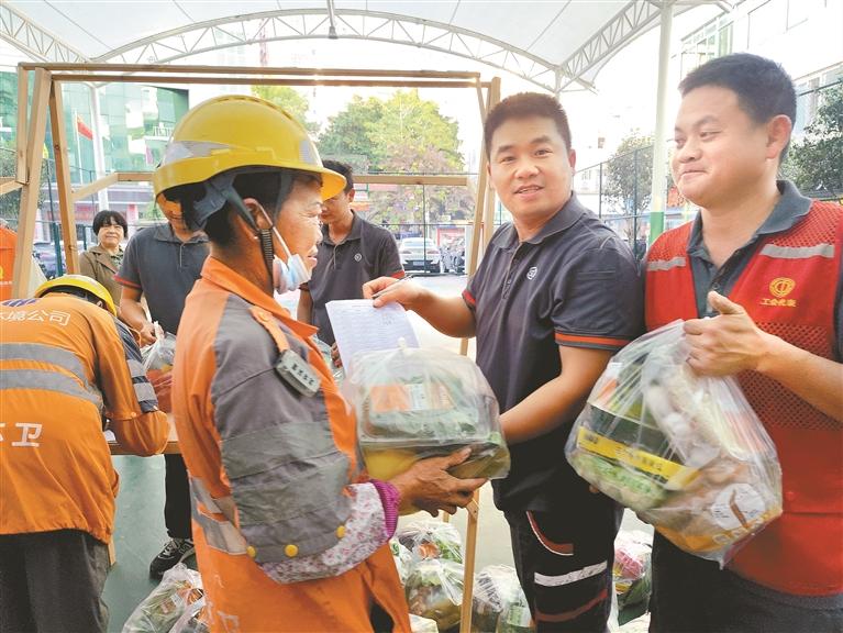 快递小哥志愿者为环卫工人送上“暖心果蔬包”。