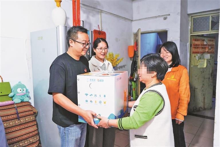 民乐社区工作人员和爱心商盟代表为困境儿童家庭送来“温暖包”。