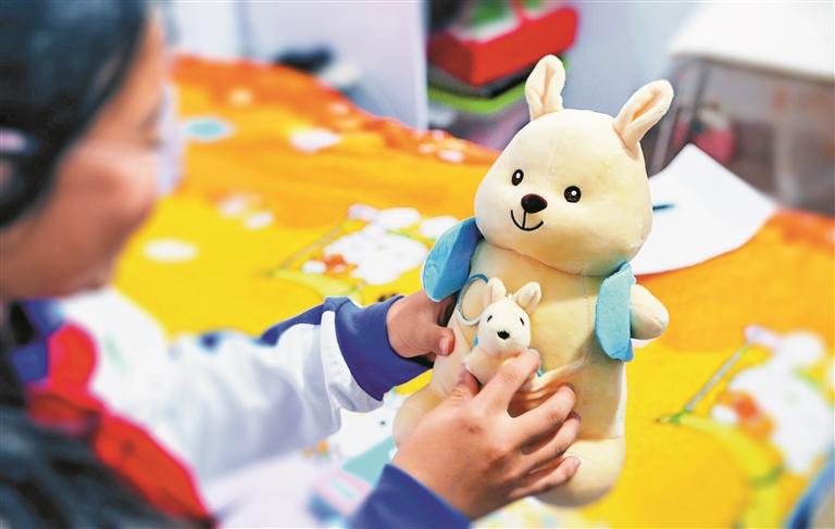 ◀儿童对“温暖包”内的公仔爱不释手。