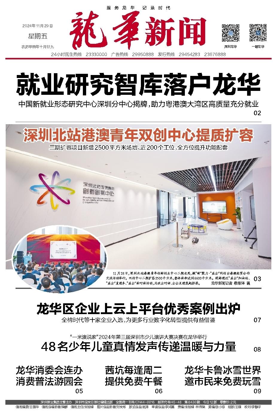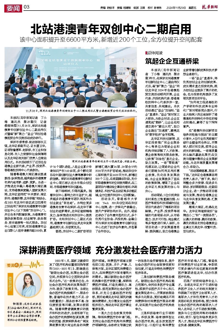 11月28日,深圳北站港澳青年创新创业中心二期启用,凝“新”聚力·“益企”同创台港澳经贸合作交流活动举行。双创中心二期扩容2500平方米,整体面积达到6600平方米。现场通过“益企”加油站、“益企”直通车、“益企”面对面活动,为政企对话、企企互通筑起桥梁。 龙华新闻记者 蔡维泽 摄